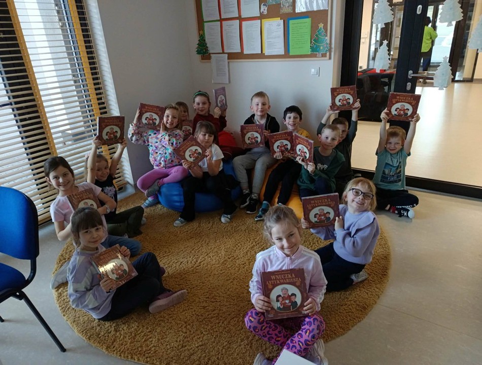 z nowościami książkowymi, które ostatnio zostały zakupione. Oczywiście zainteresował ich dział dla najmłodszych czytelników, z którego wybrali do głośnego czytania wiersze Juliana Tuwima. Większość z nich wszyscy znali jeszcze z przedszkola, nie było więc problemu z rozwiązywaniem zagadek i rebusów. Na zakończenie spotkania wszyscy otrzymali książkę Justyny Bednarek " Wnuczka antykwariusza" oraz przewodnik dla rodziców pierwszoklasisty.