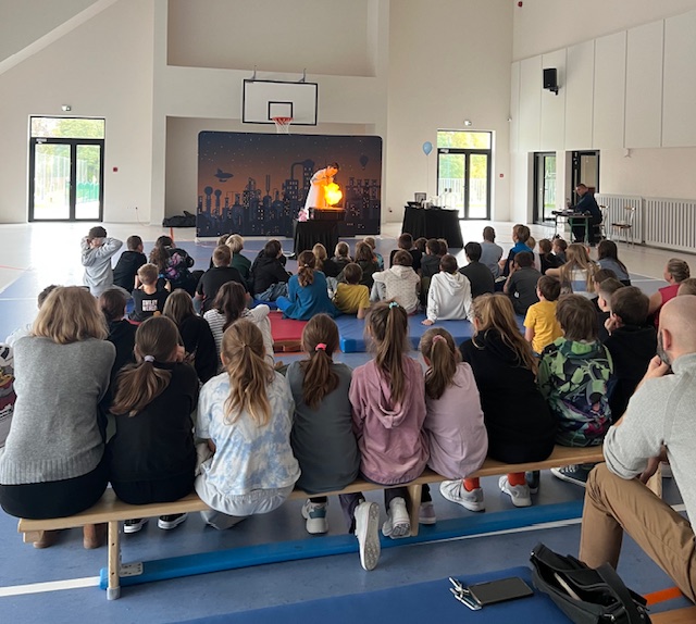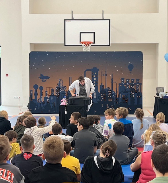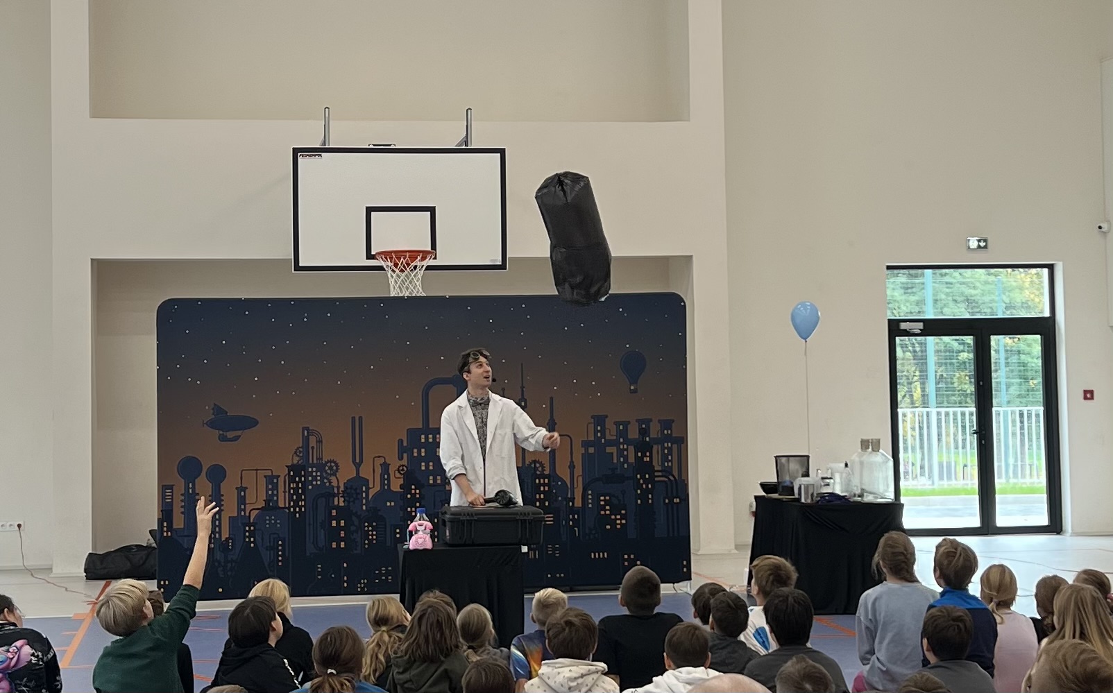 W naszej szkole zagościł naukowy teatr pełen efektów specjalnych, eksplozji i... ekologii! „Eko-Show: Chmurka i Profesorek Mistrzowie Energii” to niezwykły spektakl edukacyjny, który połączył teatr interaktywny z pokazem doświadczeń fizyczno-chemicznych. Scena zamieniła się w prawdziwe laboratorium, a widzowie – w aktywnych uczestników naukowej przygody. W pogodnej, bajkowej scenerii pojawiła się Chmurka Cumuluska – roztańczona, rozśpiewana bohaterka, która z zaskoczeniem odkrywała z uczniami, że świat nie jest już tak czysty jak kiedyś. Jej beztroski lot przerwał smog – szary, duszący i przerażający. Wtedy na ratunek przybył Profesorek, fizyk i popularyzator nauki z arsenałem spektakularnych eksperymentów.