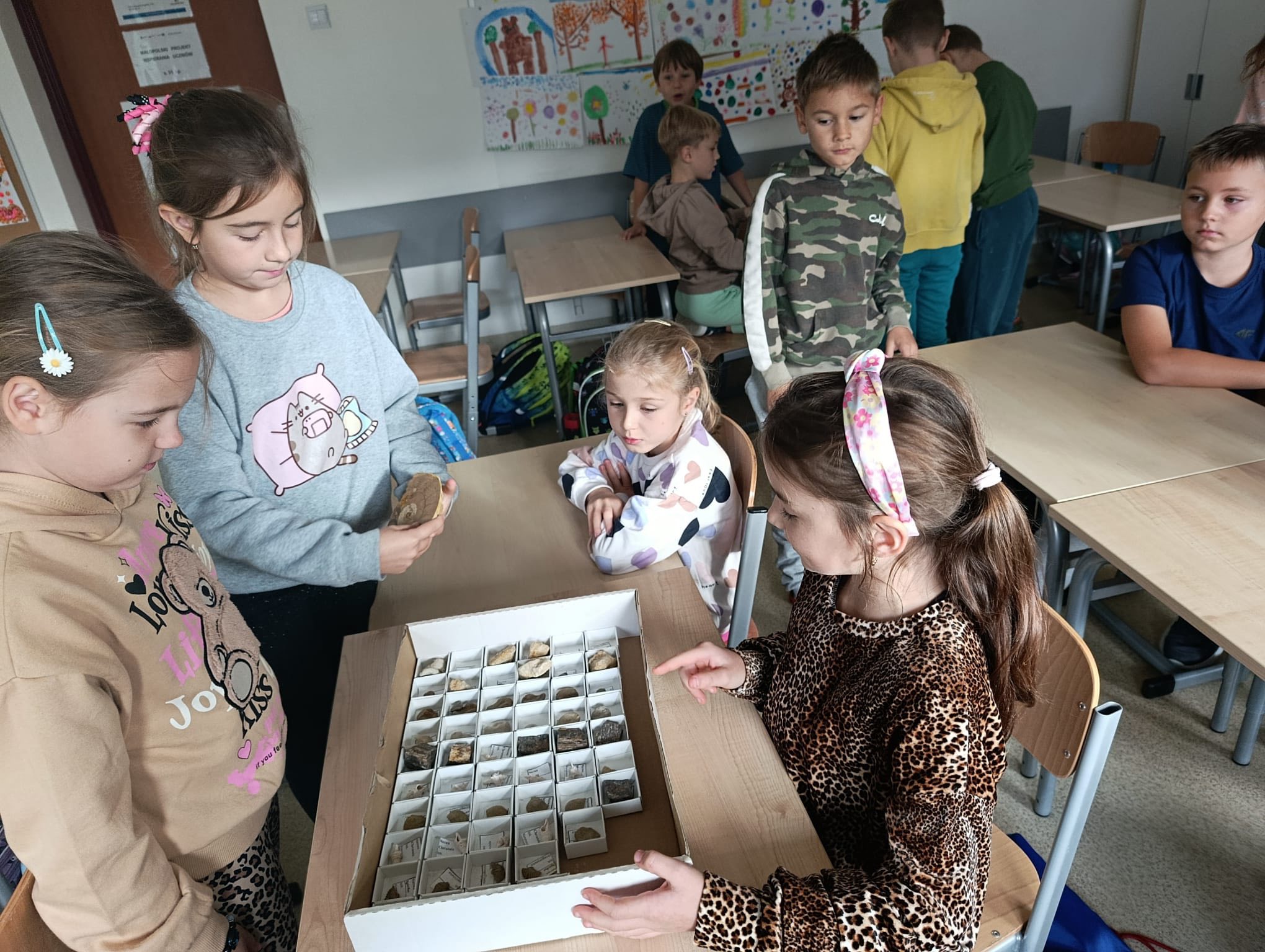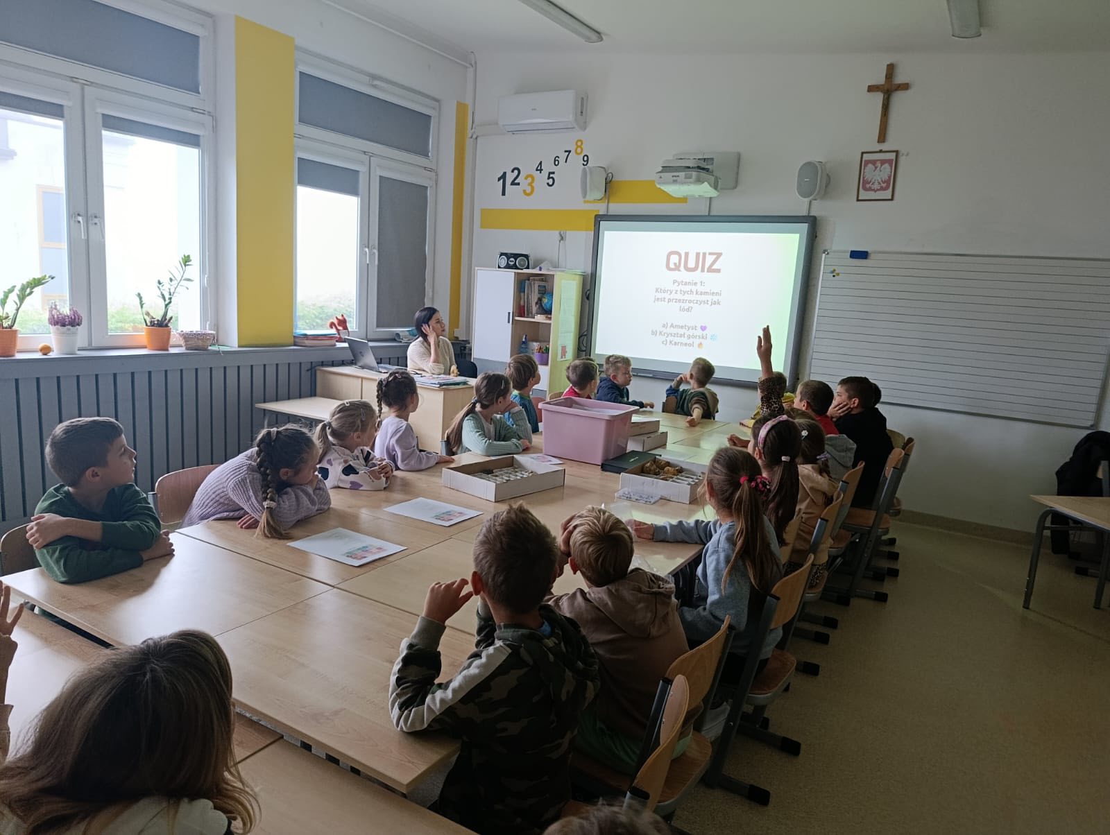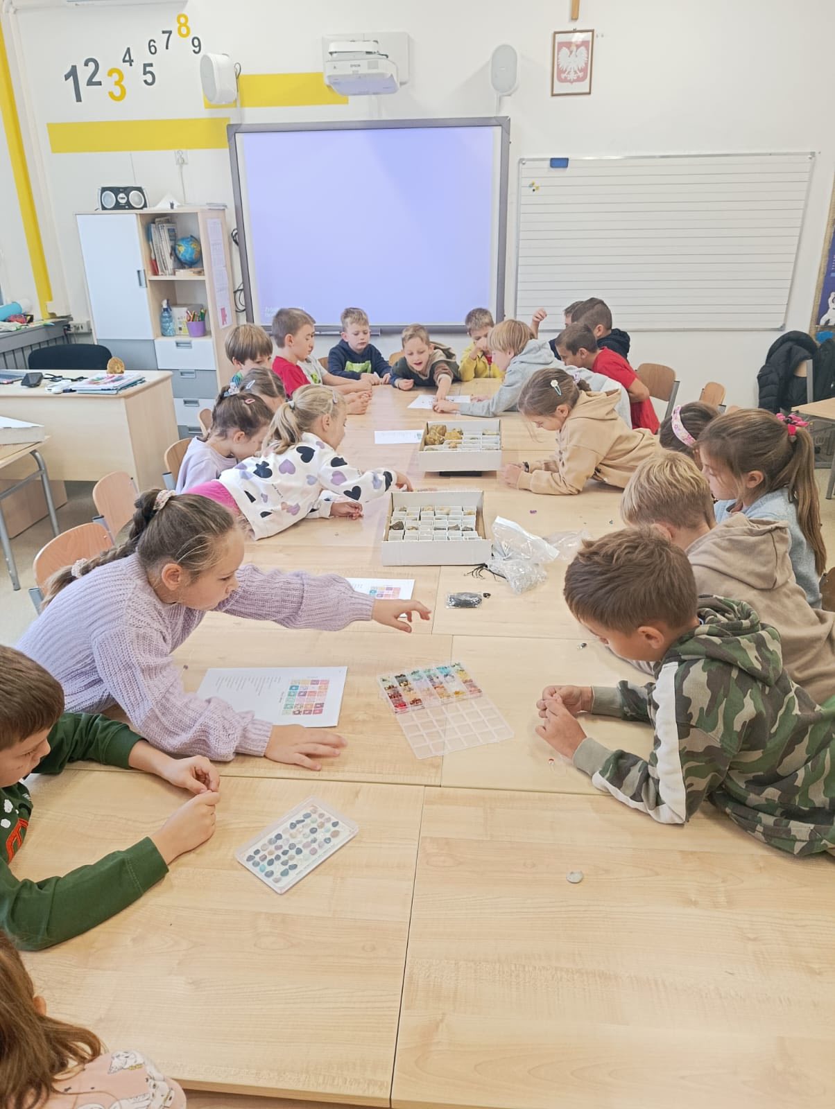 Uczniowie poznali nowe pojęcia, takie jak amonit i minerał, a na zakończenie zajęć wykonali piękne bransoletki .