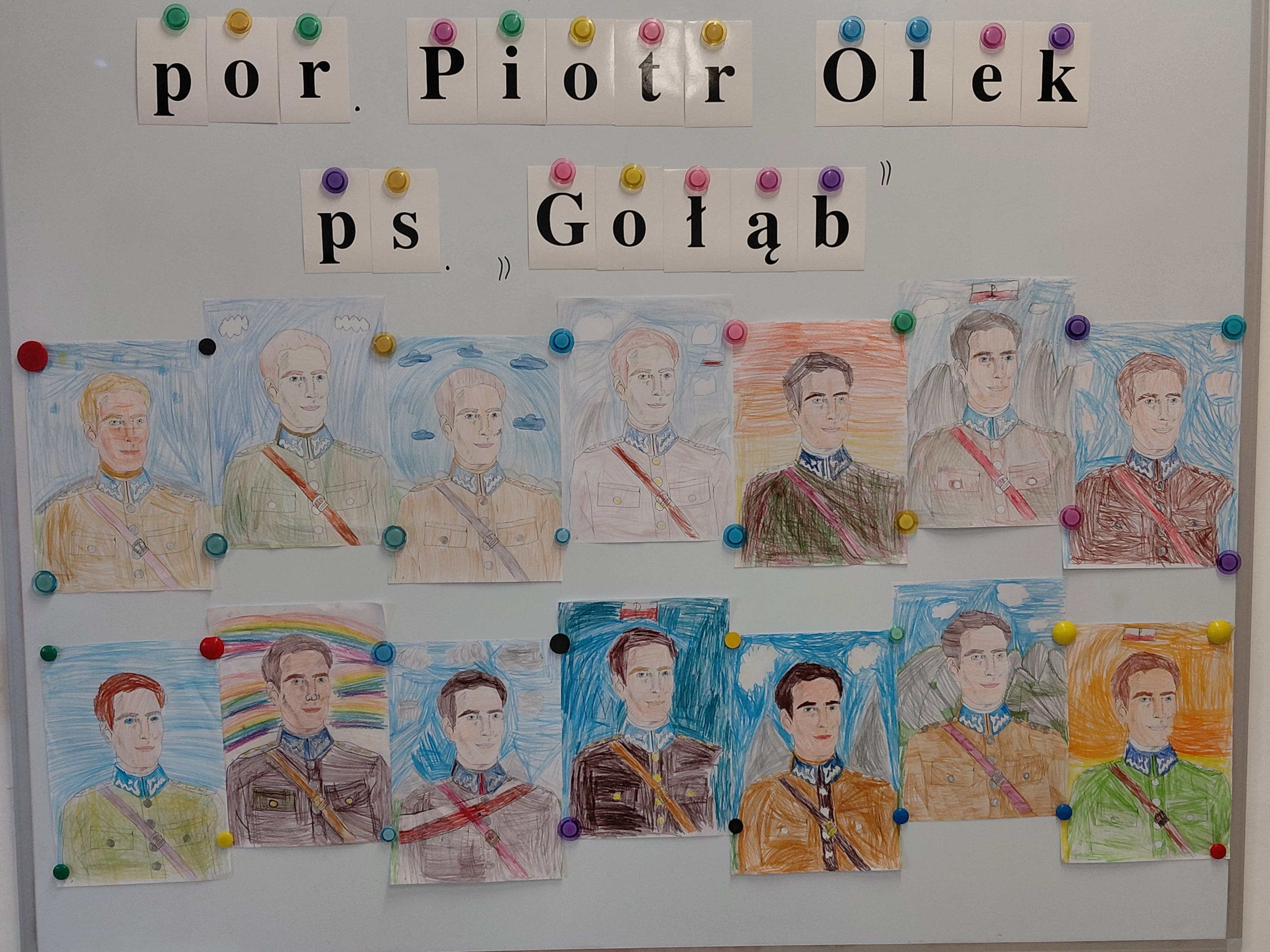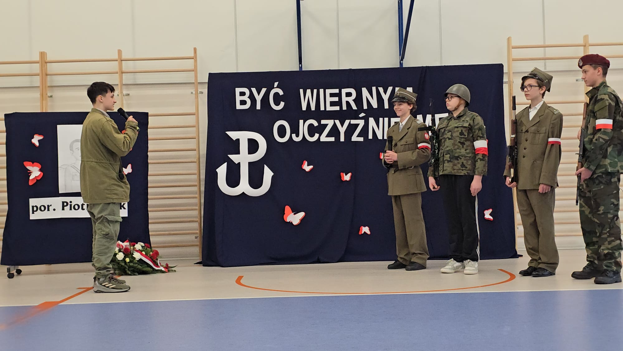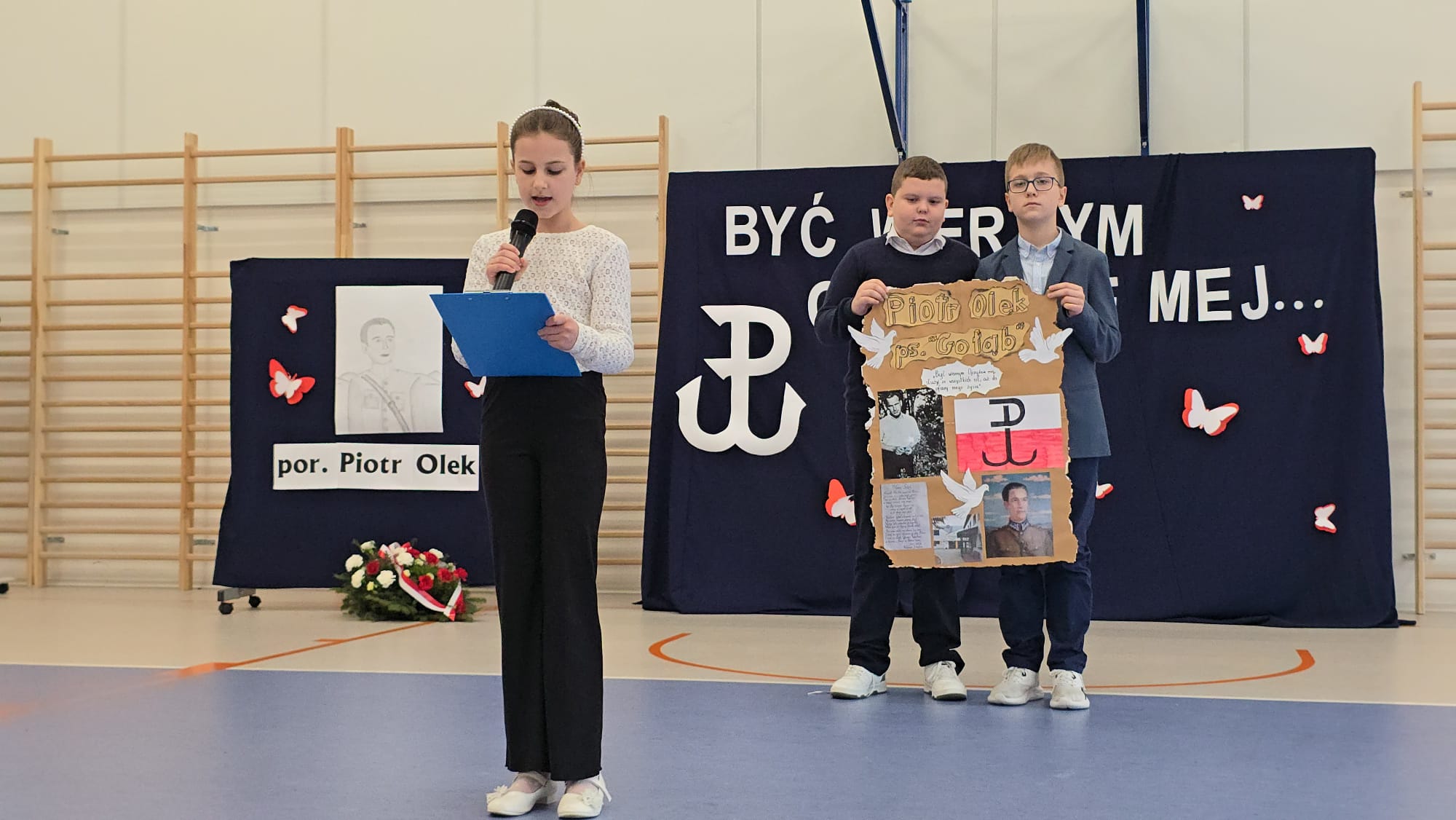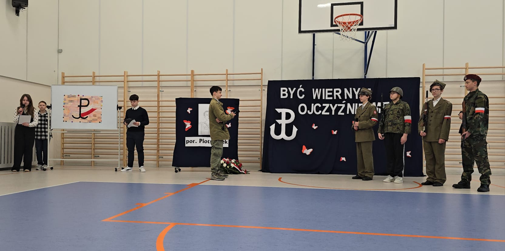z nowoczesnością (klasaVI), rekonstrukcja sceny składania przysięgi przez żołnierzy polskiego podziemia (klasa VII), wiersz o Patronie i monolog liryczny Bohatera (klasa VIII). Ponadto uczniowie wykonali plakaty, na których motywem przewodnim był znak Polski Walczącej oraz barwy narodowe. Wychowankowie klas I- III przygotowali także  wystawę portretów porucznika, a uczniowie klasy IV odpowiadali na pytania dotyczące historii szkoły i faktów z życia Piotra Olka. Delegacja młodzieży