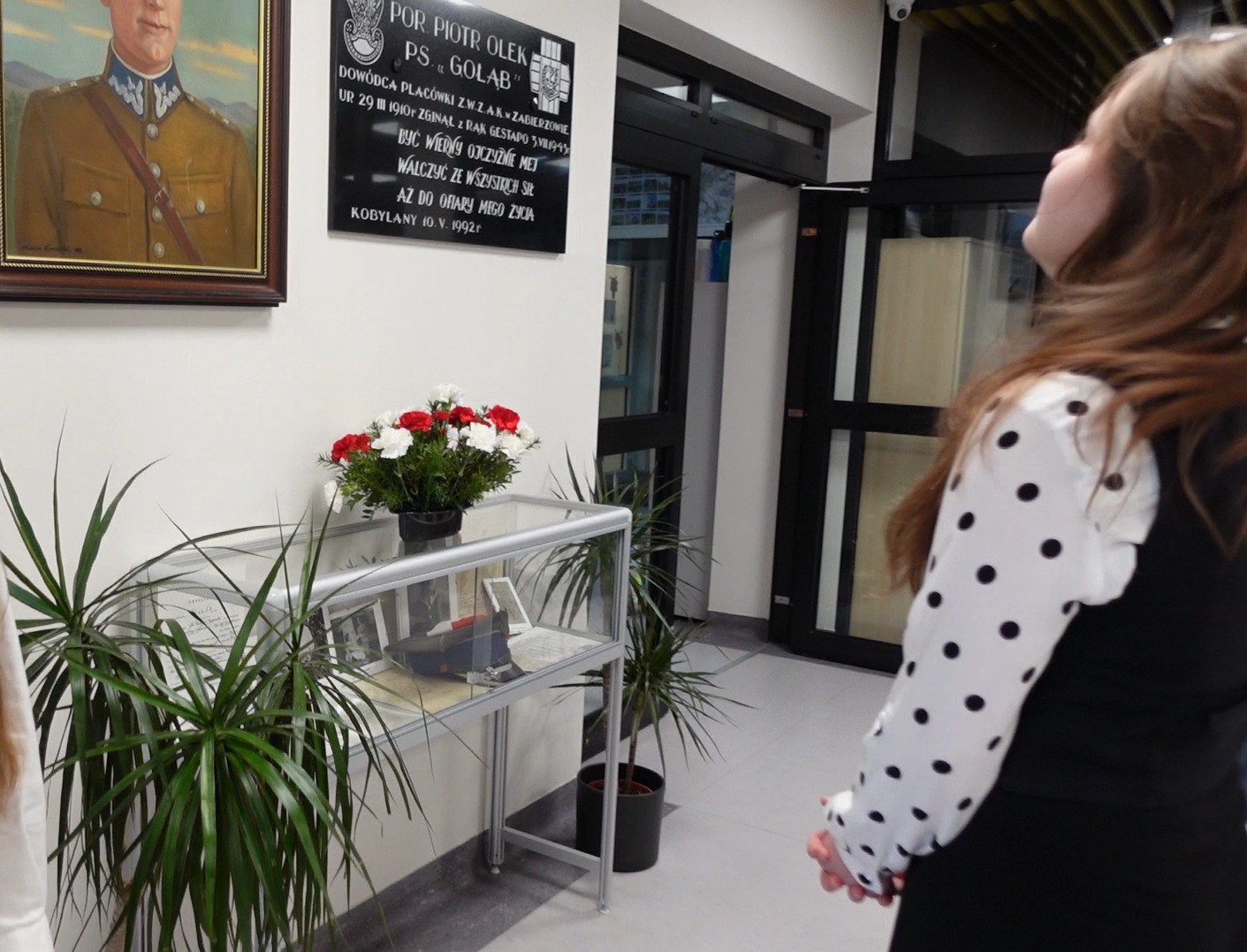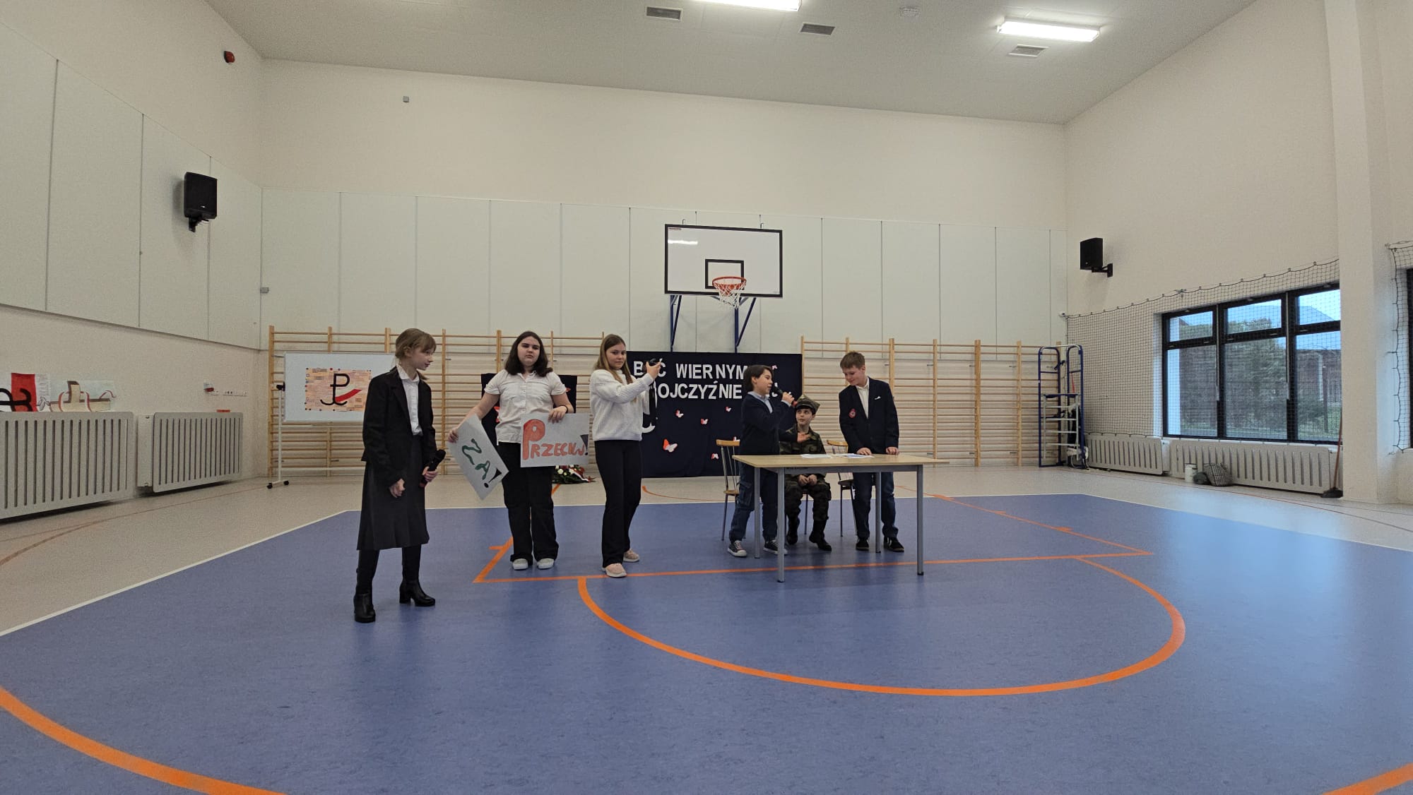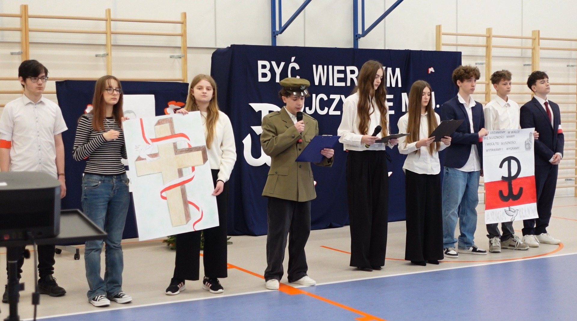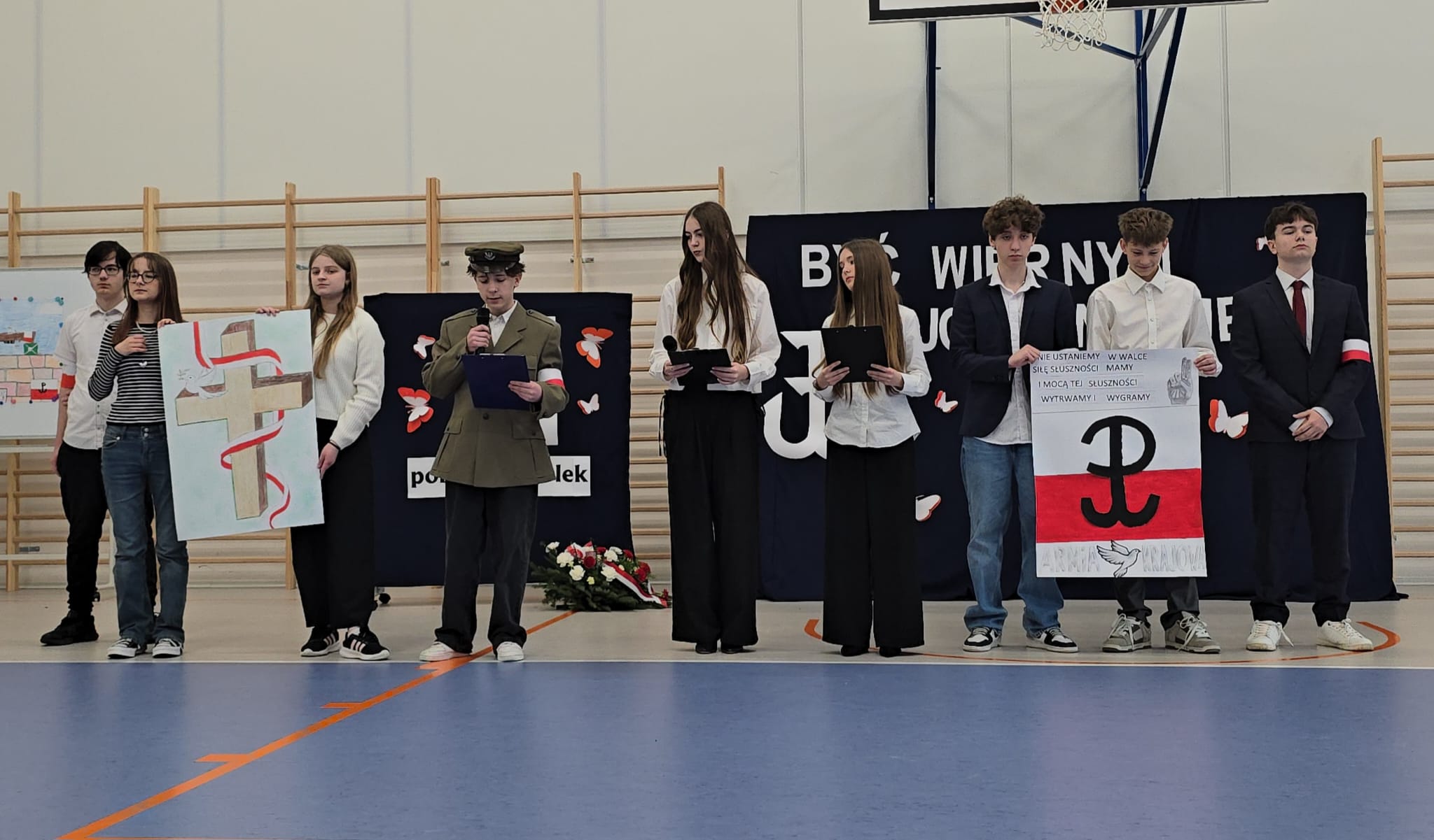 z nowoczesnością (klasaVI), rekonstrukcja sceny składania przysięgi przez żołnierzy polskiego podziemia (klasa VII), wiersz o Patronie i monolog liryczny Bohatera (klasa VIII). Ponadto uczniowie wykonali plakaty, na których motywem przewodnim był znak Polski Walczącej oraz barwy narodowe. Wychowankowie klas I- III przygotowali także  wystawę portretów porucznika, a uczniowie klasy IV odpowiadali na pytania dotyczące historii szkoły i faktów z życia Piotra Olka. Delegacja młodzieży